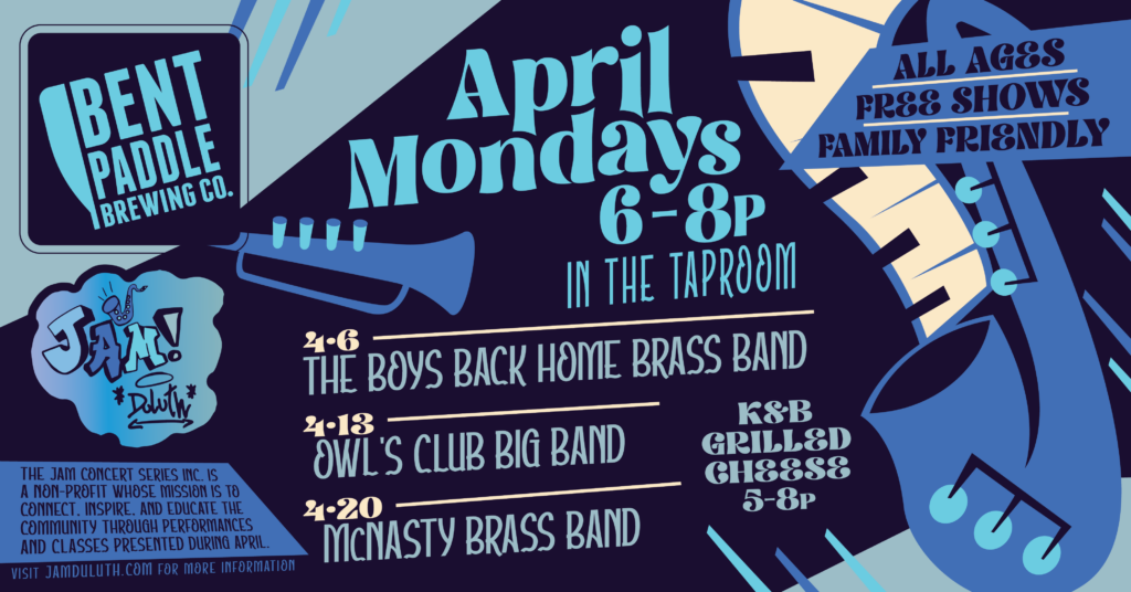 Happy Jazz Appreciation Month. Come to Bent Paddle every Monday in April to experience some of Minnesota’s finest jazz bands! BONUS – Every Monday is Industry Night! Show a worker ID or pay stub for $1 off all Bent Paddle beverages. Everyone is welcome. Come for the tunes, stay for the conversations, delicious beverages, and good times.